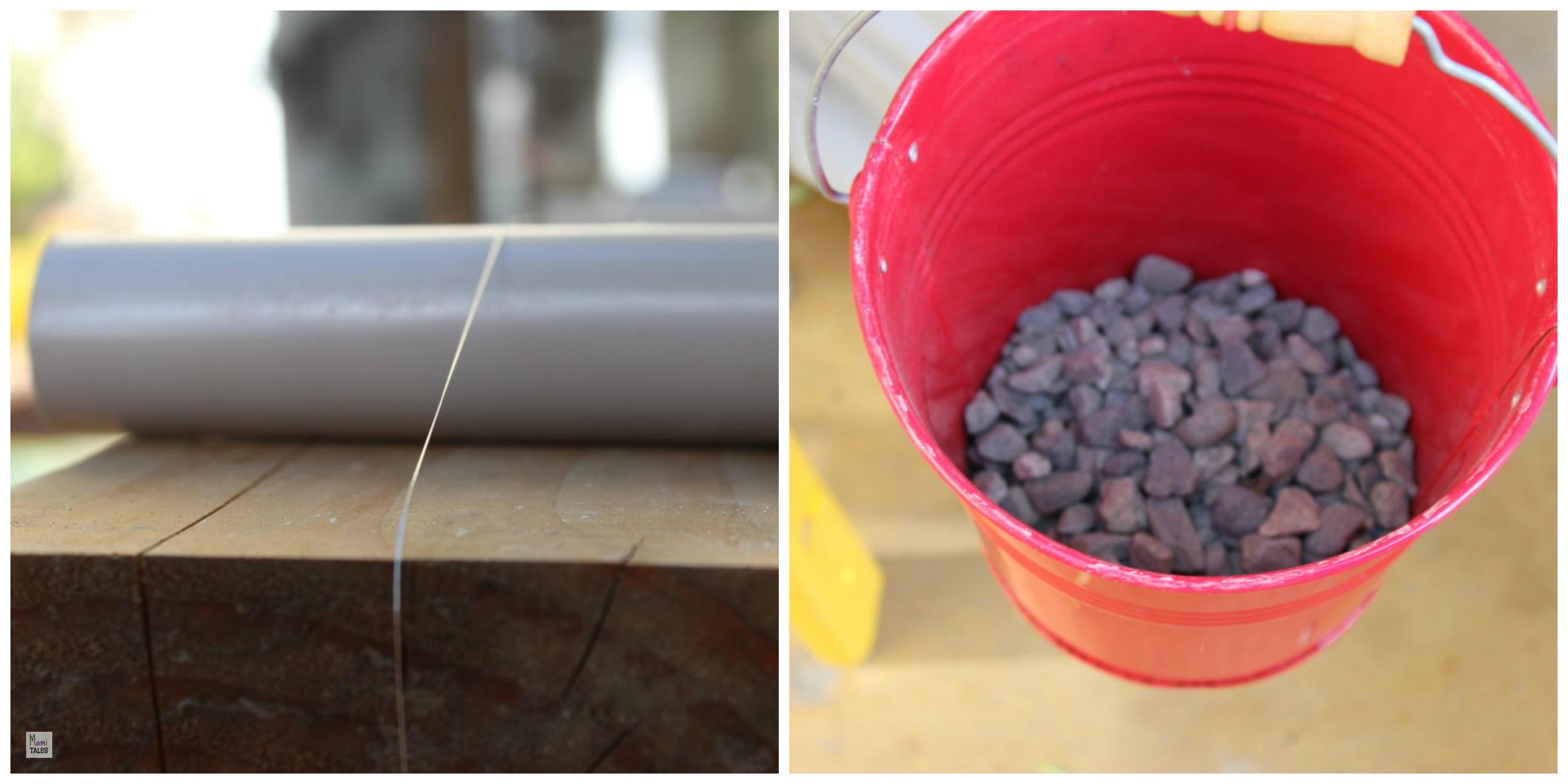 Fist they attached the string to a screw, then they used a raised wooden board, two pieces of hollow PVC pipe and a bucket with some gravel attached to the other end of the string, to change tension.