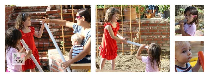 While the dads were preparing the contraption, the kids and I used different sizes of PVC tubes to see how the sizes would affect the sound they made. Even Tiny A, the youngest scientist of the bunch, had a go at that.